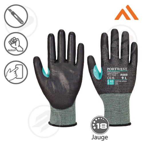 Gant résistant aux coupures niveau E jauge 18 avec revêtement en PU offrant une prise sûre dans les environnements de manipulation secs et légèrement huileux. Un renfort pouce ajoute une durabilité supplémentaire. La doublure respirante de jauge 18 offre une dextérité et un confort optimaux. Convient pour une utilisation avec des appareils à écran tactile. Le marquage rétro réfléchissant augmente la visibilité des gants dans des conditions de faible luminosité.