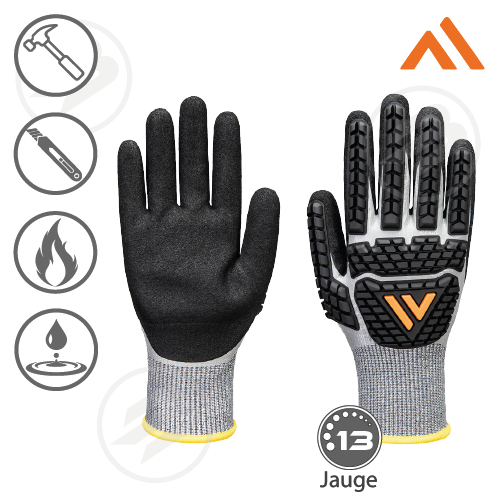 Conçu pour les environnements difficiles, ce gant est doté d’une doublure résistante de calibre 13 offrant un ajustement sûr et précis. Son imperméabilité et sa conception résistante aux chocs assurent une protection fiable contre l’humidité et les impacts d’énergie moyenne. Avec un indice de résistance aux coupures de niveau F et une protection contre la chaleur de contact jusqu’à 100 °C, il est idéal pour les tâches exigeantes. Certifié CE et muni d’une étiquette de présentation, ce gant est un choix pratique et protecteur.