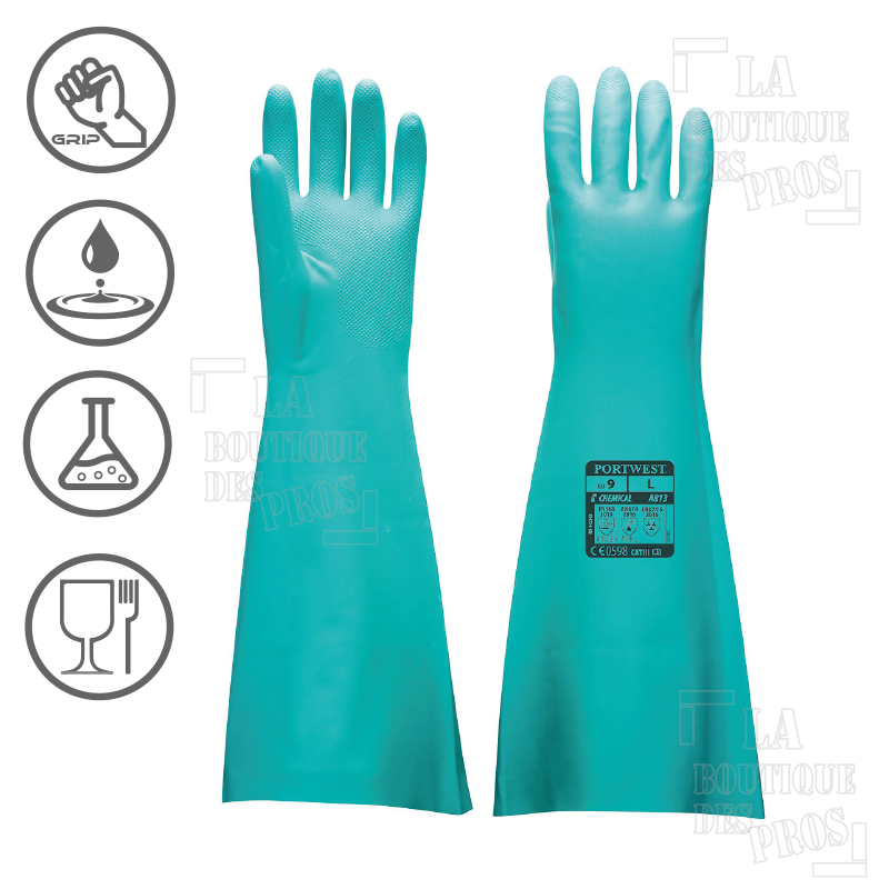 Ce gant extrêmement long de 48cm offre une excellente protection contre de nombreux solvants. Conçu avec un motif antidérapant, l’A813 offre une bonne adhérence en milieu sec et humide. L’épaisseur de 0,55 mm assure une bonne résistance à l’abrasion. Convient à une gamme d’industries telles que la maintenance industrielle, le fourrage en mer, l’impression et la chimie.