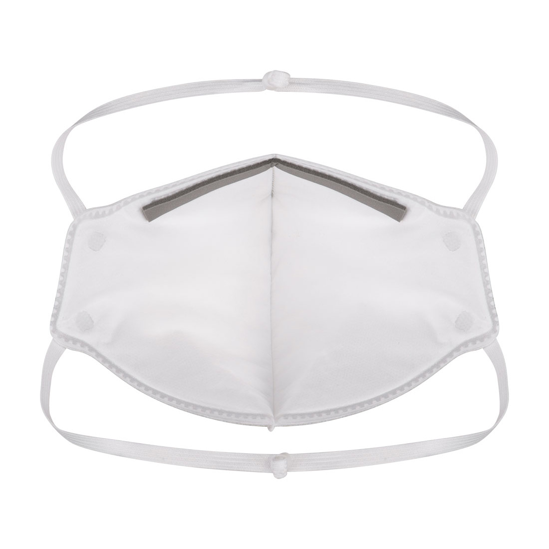 Masque respiratoire jetable sans valve, vertical et plié à plat avec chaque masque à l’intérieur emballé dans un poly-sac individuel pour un rangement plus facile. Pince-nez réglable pour un ajustement et un confort optimisés.