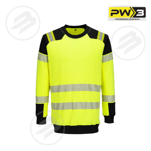 Le sweat-shirt PW3 Modaflame haute visibilité et résistant à la flamme (FR) est idéal pour les travailleurs exposés à la chaleur dans leur environnement de travail. Les caractéristiques de ce vêtement comprennent les manches raglan, un col rond et des poignets bord côte, ce qui le rend confortable et facile à porter.